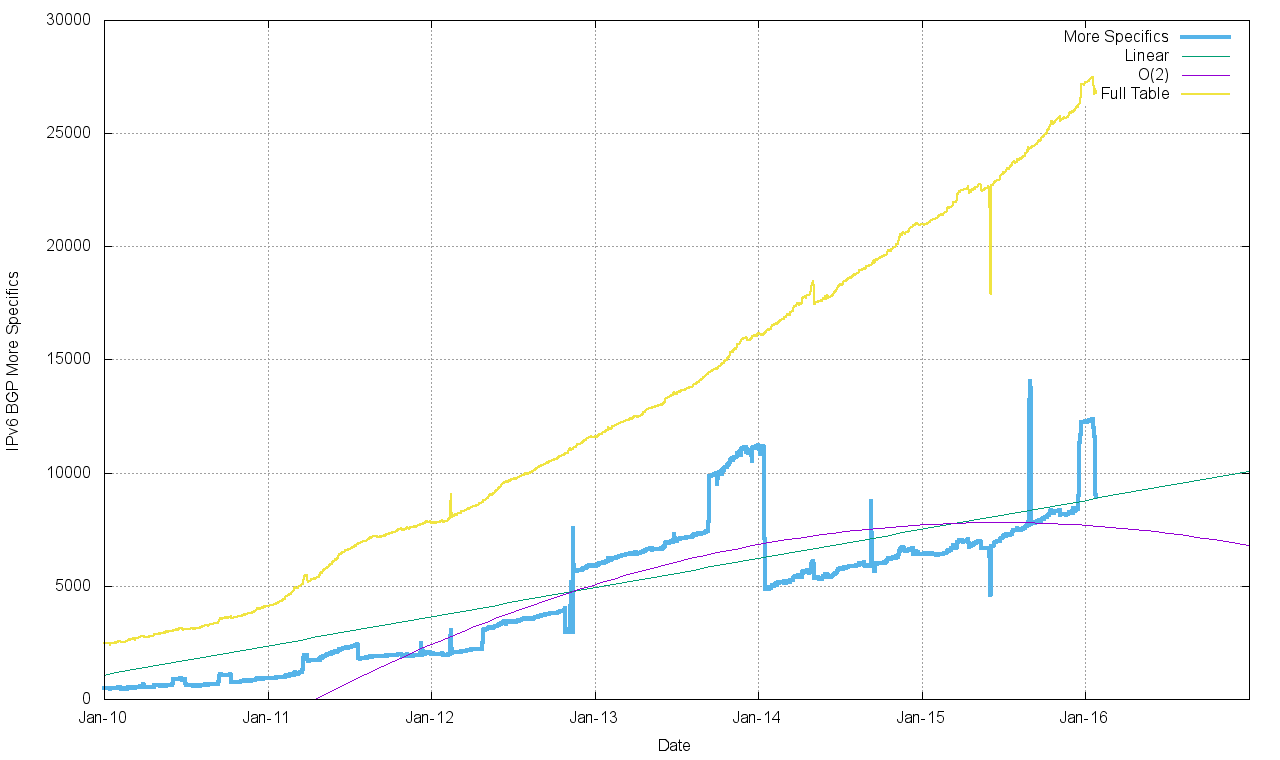 The linear and exponential projections in Table 4 provide a reasonable estimate of the low and high bounds of the growth of the IPv6 BGP routing table in the coming yearsAt this point these figures are not a cause for any significant concern.
