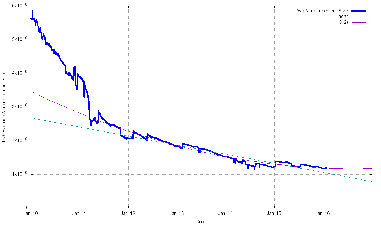 There are a number of interesting aspects to this growth where the characteristics of IPv4 look to be appearing in IPv6. The number of more specific advertisements of existing aggregate announcements is rising much faster than the number of aggregate announcements, and the majority of the growth in 2015 was in the use of more specific route announcements rather than in root announcements. More specifics are now 44% of the total IPv6 routing table. However, most notable is an inherent contradiction in the metrics for the IPv6 network. In 2015 the relative number of users who are running IPv6 grew by some 60%, from 3% of all users at the start of 2015 to 4.7% at the end of the year. Yet the metrics of routing IPv6 do not reflect that 60% growth, and the 2015 growth rates for the infrastructure of the IPv6 internet appear to be around 20% - 30% for 2015.