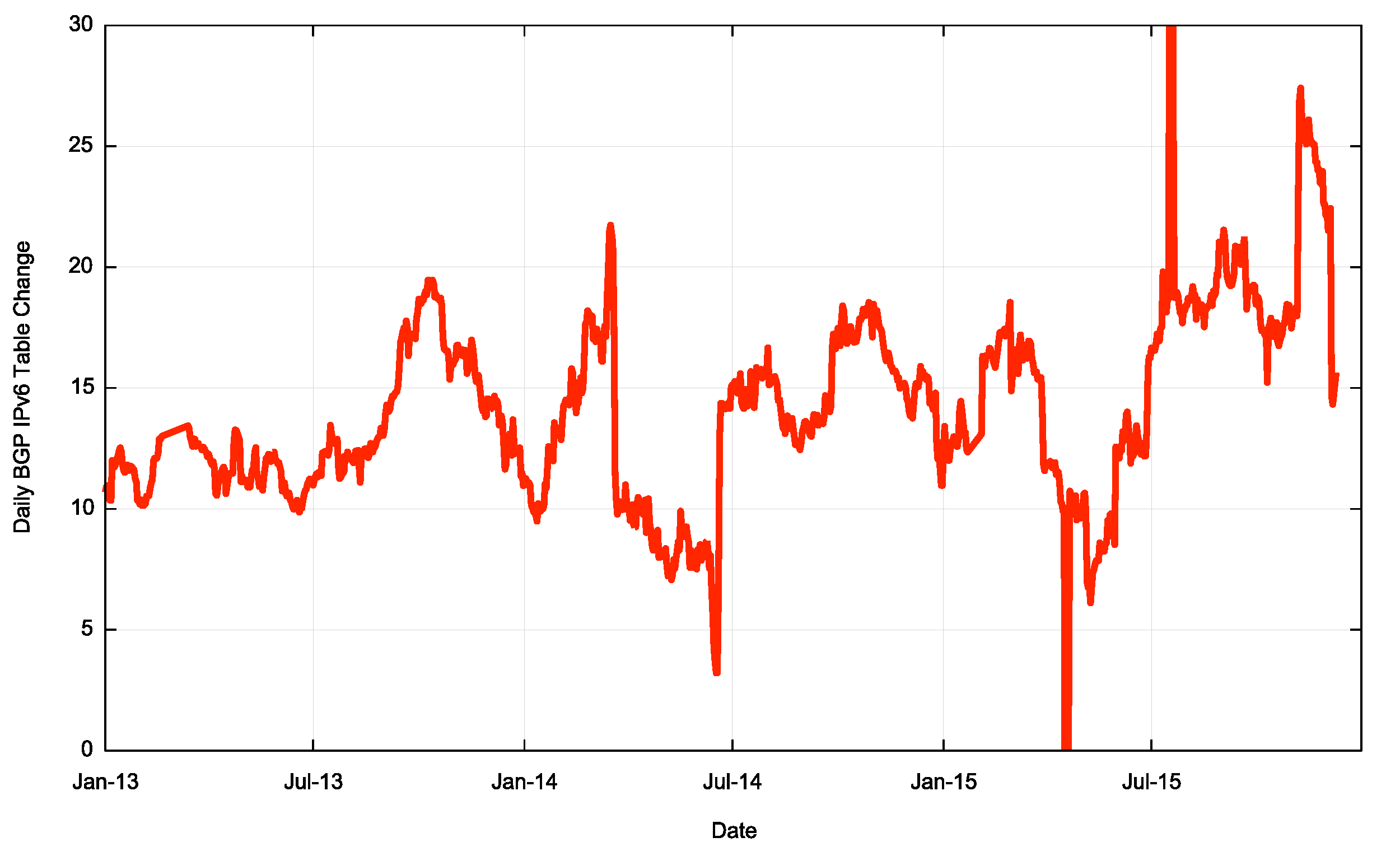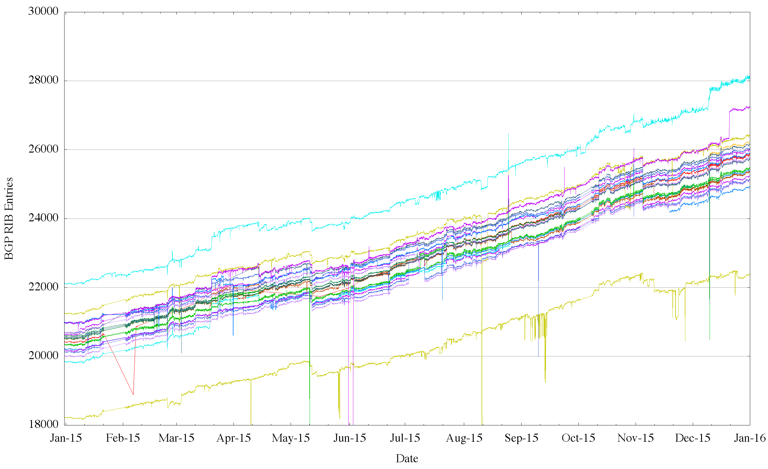 Figure 8 also shows that the period between mid September 2014 until the end of the year was when each individual peer of Route Views exceeded 512,000 IPv4 routes. High Speed routing equipment uses high speed cache memory to store the routing table in the lookup tables, and the size of this lookup cache is a compromise between price, power and capability. Older routing equipment with these high speed lookup caches were typically configured to hold up to 512,000 IPv4 routing entries, and when this limit is exceeded then this equipment could perform erratically, including shutting down. By the end of 2014 most Route Views peers were carrying more than 512,000 routes, so the issues associated with this particular size threshold and older routing equipment have, hopefully been addressed.