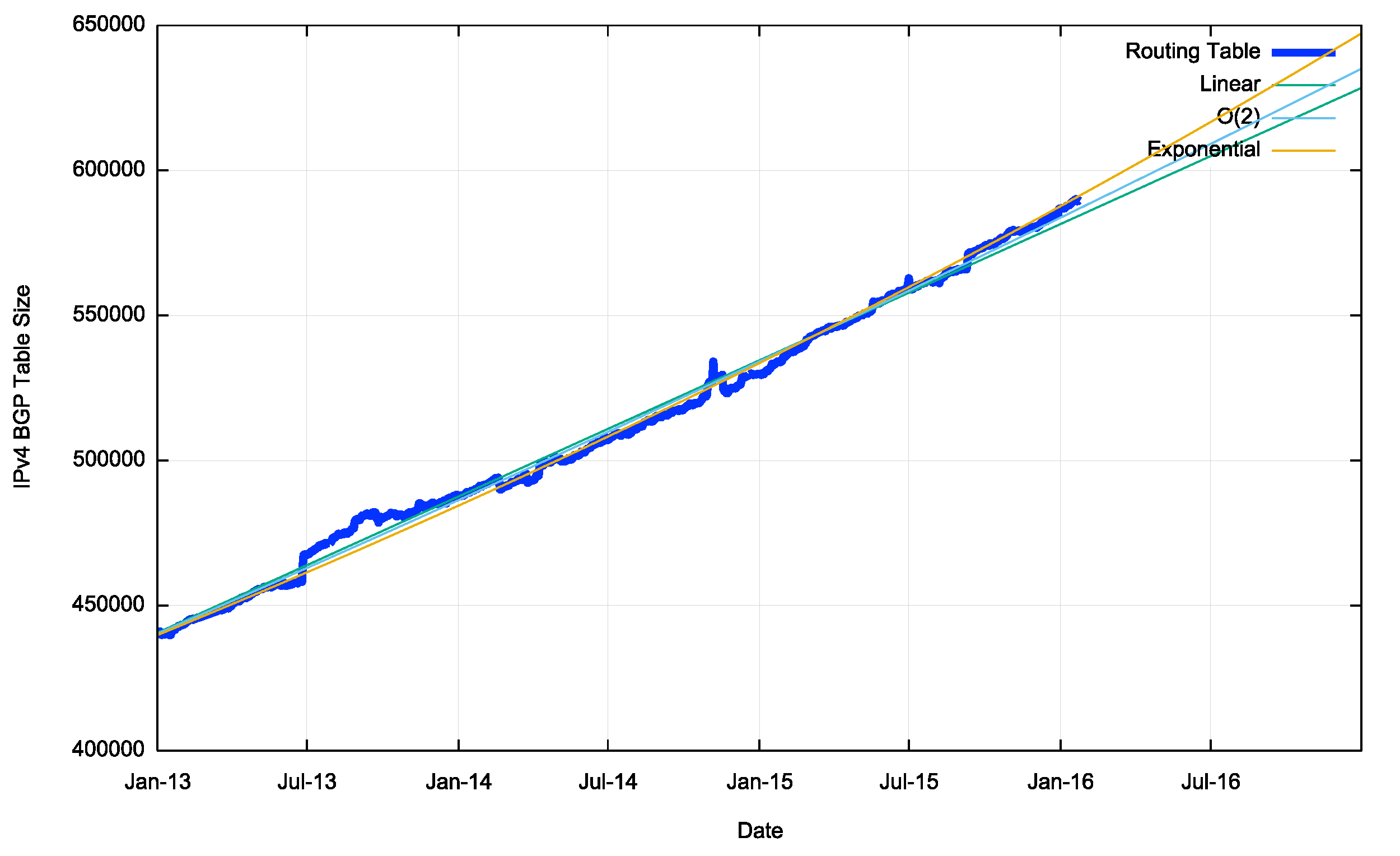 With the caveat that this prediction is based on the assumption that tomorrow will be a lot like today and that the influences that shape tomorrow have already shaped today, then its reasonable to predict that the IPv4 routing table five years from now, at the start of 2021, will contain an additional 250,000 entries, making a total for IPv4 of some 816,000 entries in the BGP routing table at that time.
