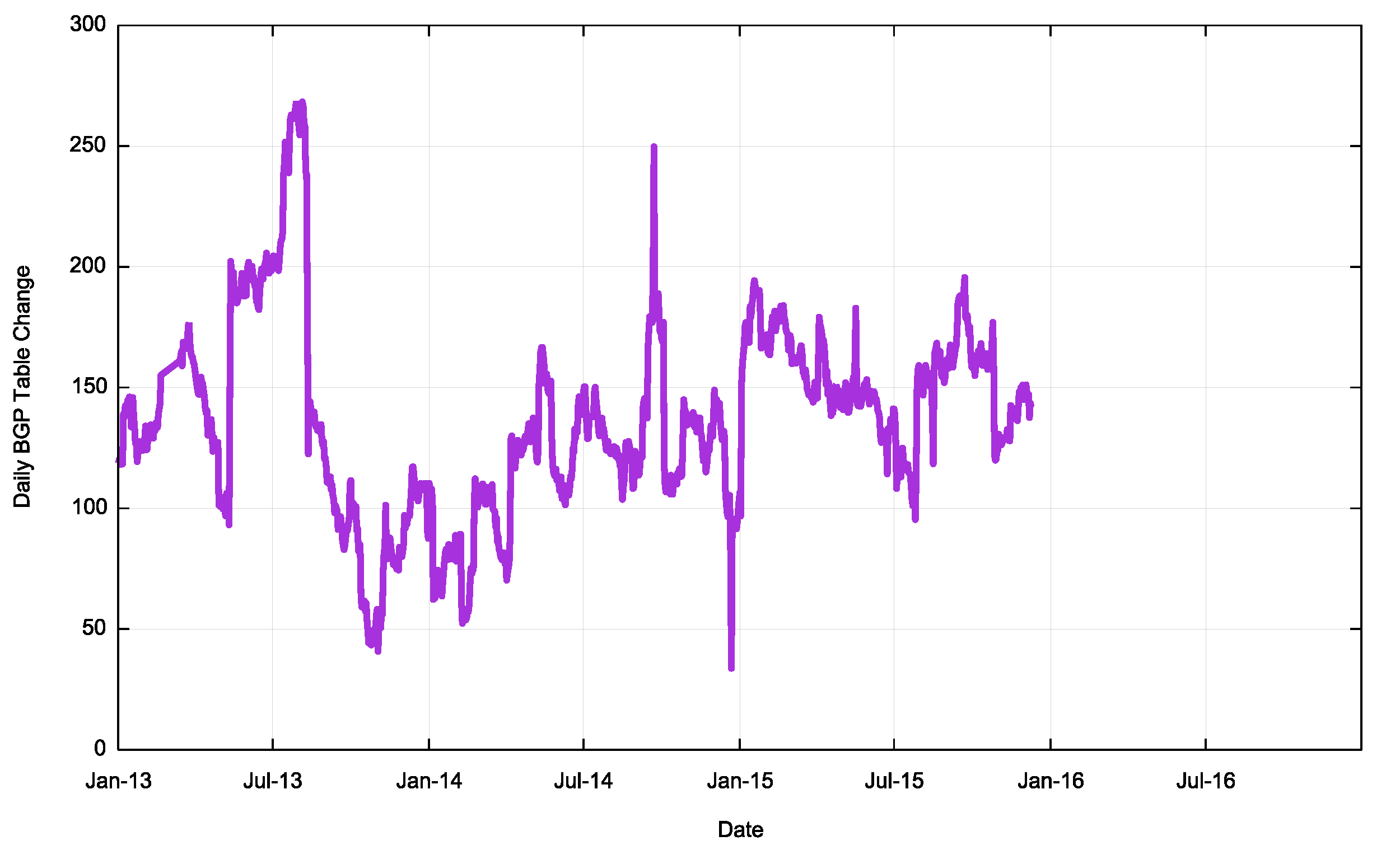 Figure 1 shows the total number of routes in the routing table over this period. This is a classic "up and to the right" Internet trajectory, but it should be noted that the days exponential growth that doubled every year are over. The growth elements in the Internet today are more strongly aligned to a far more modest linear growth model.