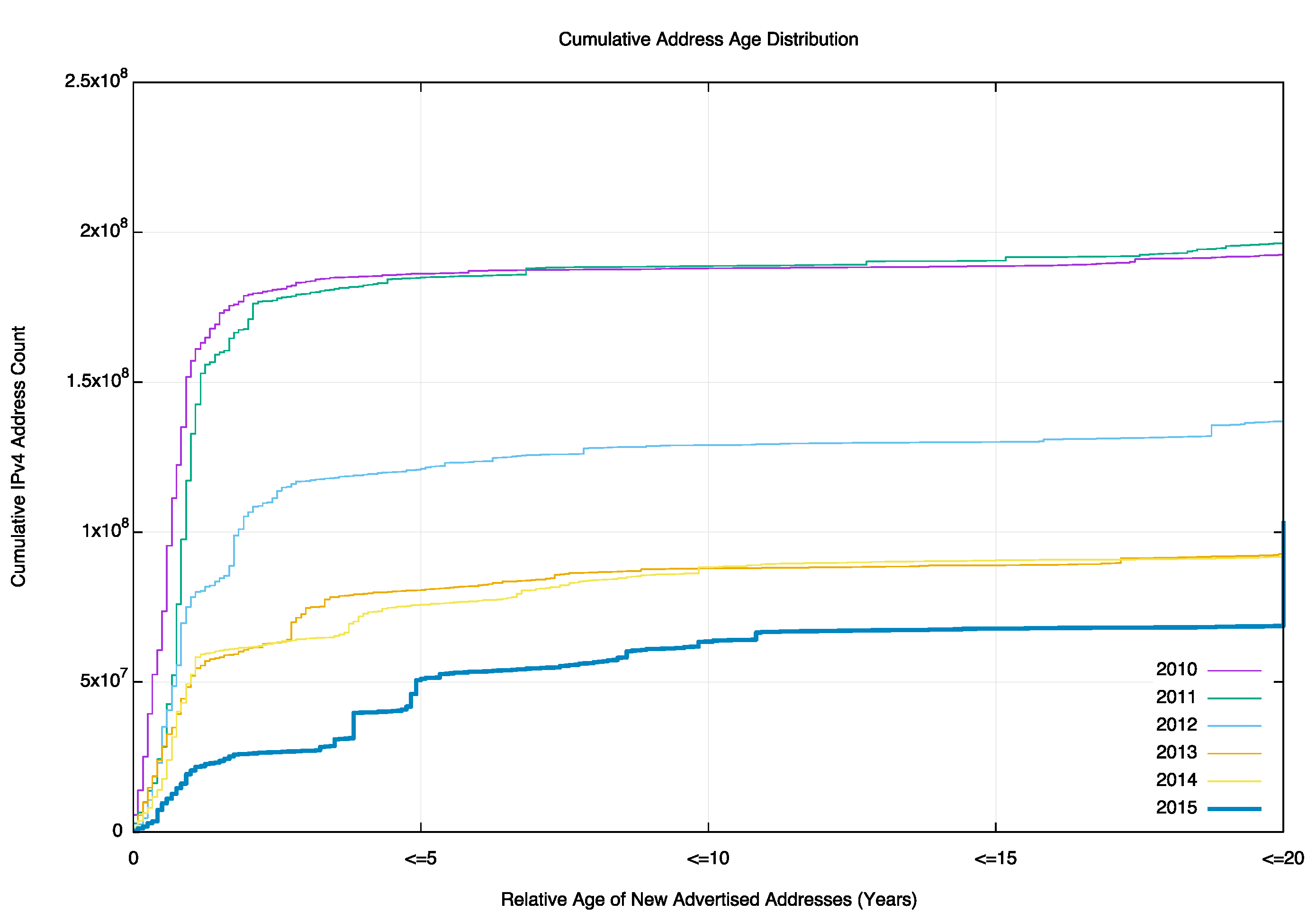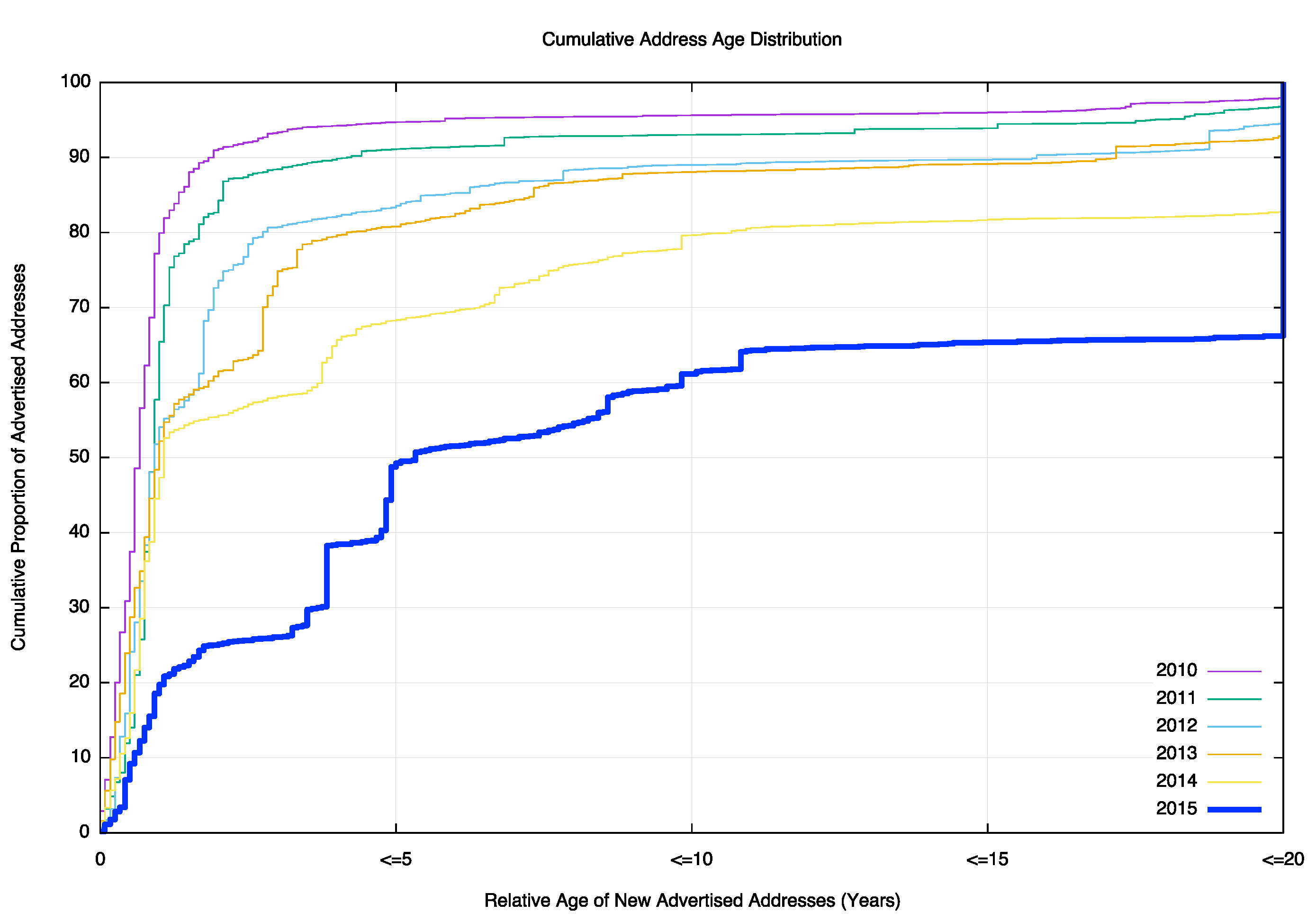 In 2010, 80% of all newly advertised addresses in the year were allocated in the same year. Most of the growth in advertised addresses in 2010 came of new allocations of address space. But with the onset of address exhaustion from 2012 onward this level has dropped. In 2014 less than half the newly advertised addresses were allocated in 2014. Some 15% of these new addresses are between 1 and 3 years old. In 2010 less than 10% of newly advertised addresses were more than 3 years old. At the time, when network operators needed further IPv4 addresses they turned to allocations from their Regional Internet Registry. In 2014 this figure has jumped to 40% of advertised addresses being more than 3 years old, and some 17% of these addresses are more than 20 years old, and were part of the early allocations that form the “legacy” address pool. In 2015 some 75% of IP addresses are more than 3 years old, and 33% are drawn from the old legacy pool.