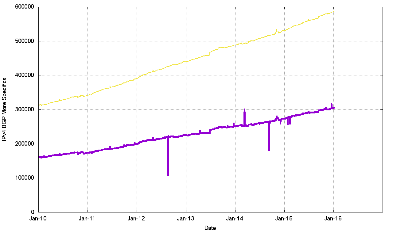 This is entirely unexpected. Given that that last ‘normal’ year of supply of new IPv4 address to fuel continued growth in the IPv4 Internet was 2010, why has the growth of the routing table occurred with such regularity?