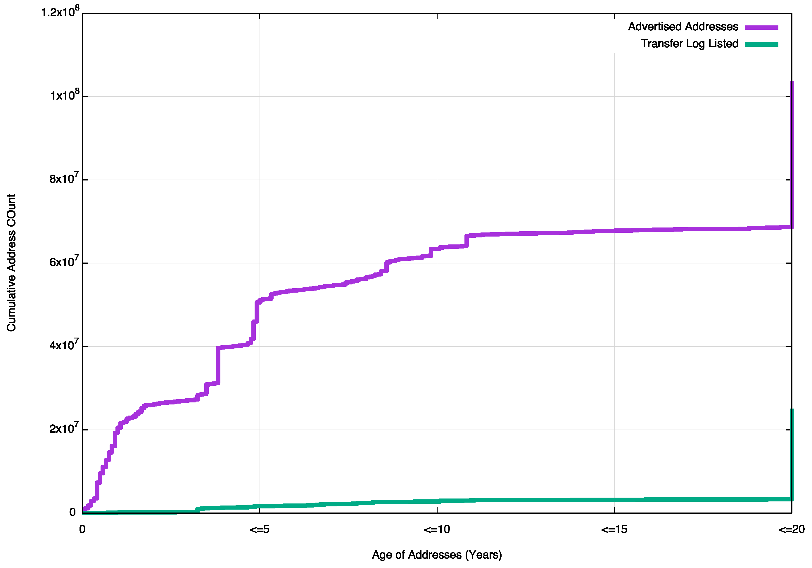 This data tends to support the intended objective of address trading in a post-address exhaustion environment, namely to allow holders of otherwise idle or non-publically used IPv4 addresses to release them for use by current network operators. This figure also shows that these new addresses that are announced in this manner are getting older each year. It appears that each year we searching for available addresses for transfer in ever-older original allocation records.