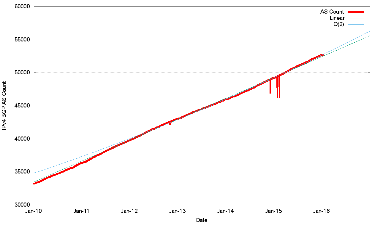 The following figures show some of the vital statistics for IPv4 in BGP since the start of 2010 to the end of 2015.
