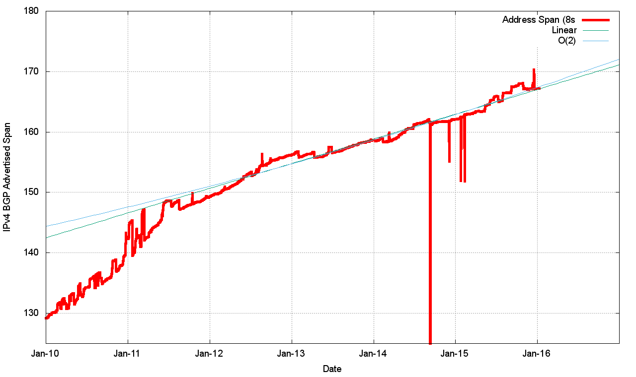 Over this period we had the exhaustion of the IPv4 address space pools in IANA in January 2011, APNIC in April 2011 (serving the Asia Pacific region), in the RIPE NCC in September 2012 (serving Europe and the Middle East), LACNIC in May 2014 (serving Latin America and the Caribbean), and ARIN in September 2015 (serving North America). The five year period since the start of 2011 has seen the span of addresses advertised in the routing system slowing down (Figure 5). However, at the same time there has been a consistent level of growth in the number of entries in the routing table over the same period. The result of these two factors is that the average announcement in the IPv4 routing table is spanning fewer addresses, or, to put it another way, the granularity of the IPv4 routing space is getting finer. As Figure 4 shows, the average BGP announcement size has dropped from 7,000 host addresses at the start of 2010 to 4,800 addresses at the end of 2015. While /24 announcements are steady at a little over 50%, the relative number of /22 announcements is increasing, while the relative number of larger announcements, including up to /21s, are decreasing. The topology of the network has remained relatively consistent, with the growth in the Internet being seen as increasing density of interconnectivity, rather than through extending transit paths, so the average AS path length has remained relatively constant, between 3.3 and 3.5 for this period (Figure 6).
