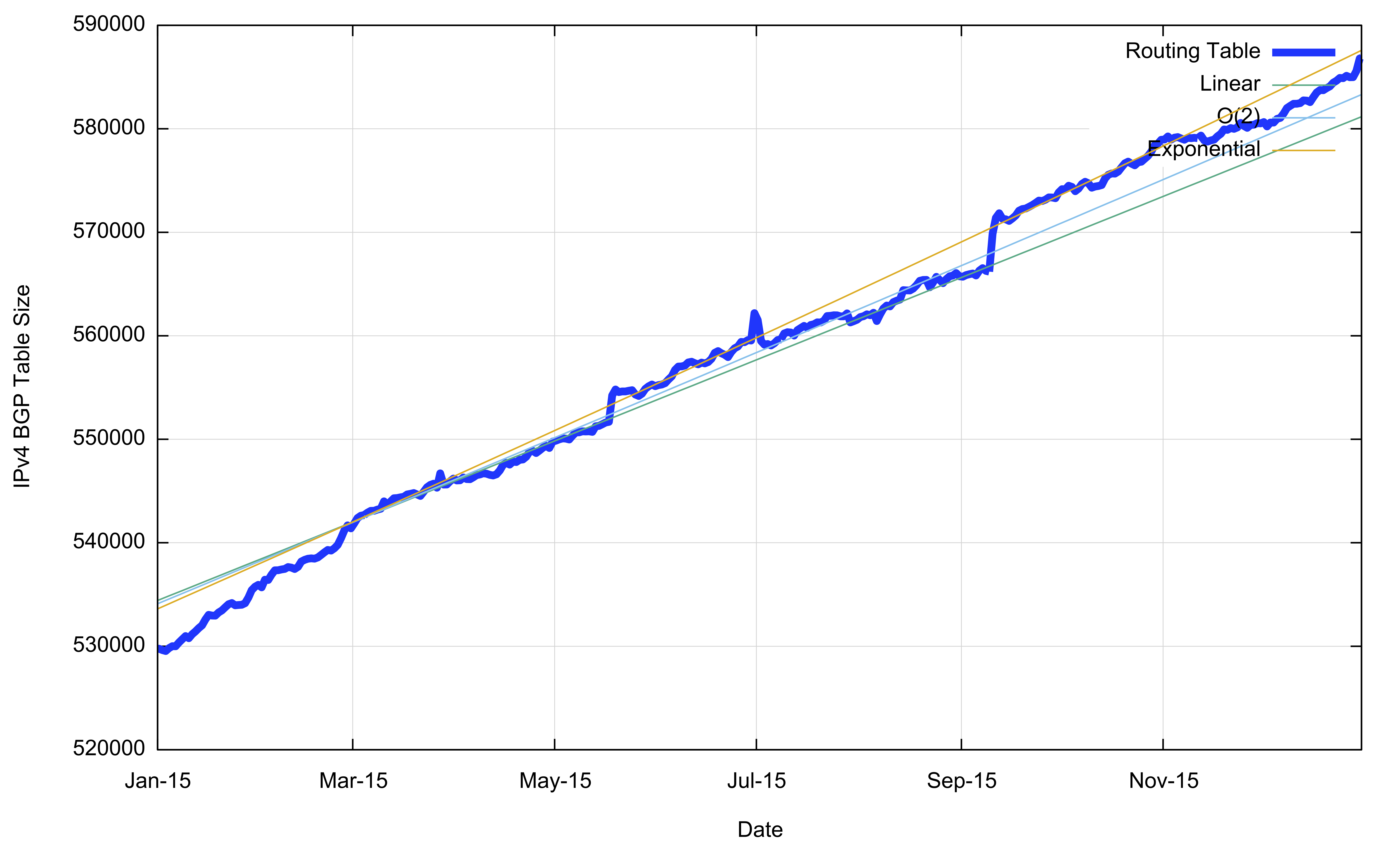 The first order differential, or the rate of growth, of the BGP routing table is shown in Figure 18. The rate of growth of the routing table appears to be increasing in the period 2009 to 2012. With the exception of the mid-2013 deaggregation event, the table growth in 2013 is at much the same level as 2012. The 2014 growth rate varied between 100 and 150 additional entries per day, which is consistent with the range of growth in the previous two years. From 2011 to the end of 2014 the average daily growth in the Ipv4 routing table has dropped from some 145 new entries per day to the current rate of some 130 new entries per day. If the first order differential matches a flat line, then the data set matches a linear slope. The data shows a slowly declining rate of growth, which is more consistent with a linear growth model than one of compound growth. The consequent predictions of IPv4 BGP table size using this constant growth model are shown in Table 3.