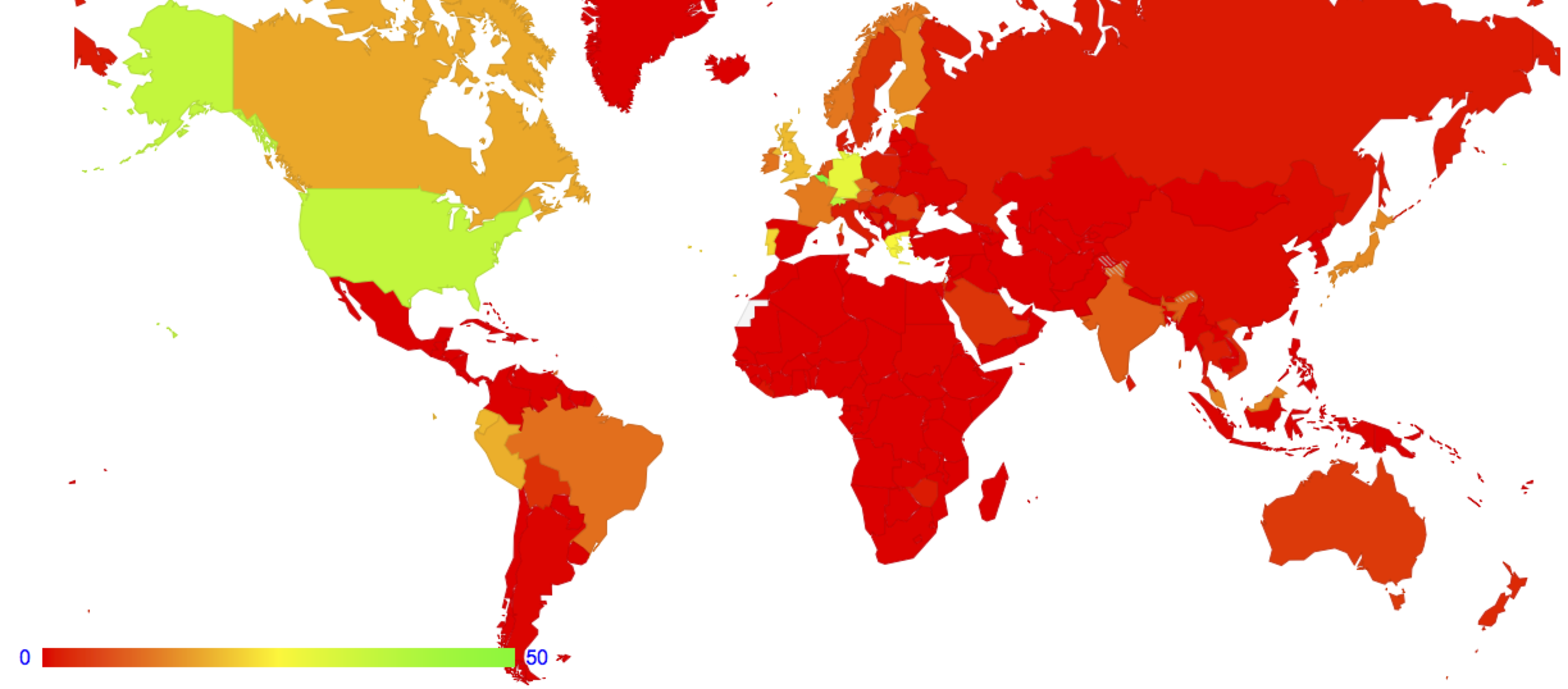 A number of groups, including the APNIC Labs group, perform extended measurements of the Internet, and report on the current state of deployment of IPv6. As a result, we can now state, with some authority, that there is large scale IPv6 deployment by service providers in Belgium, the United States, Switzerland, Greece, Germany and Portugal. We can take these per-country IPv6 measurement and use it to color a map of the world (Figure 1).