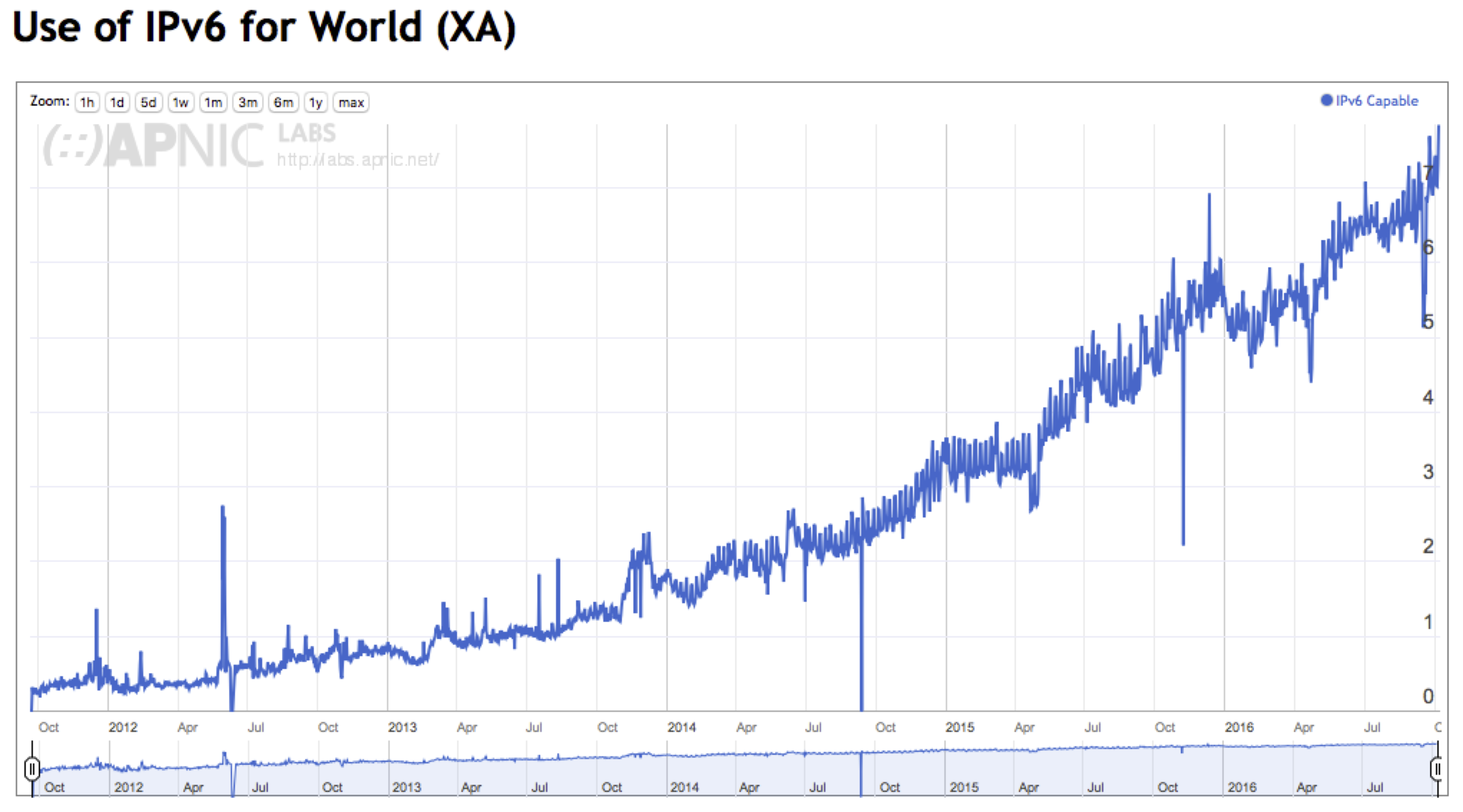 Figure 2 – Global IPv6 deployment as a time series (http://stats.labs.apnic.net/IPv6/XA)