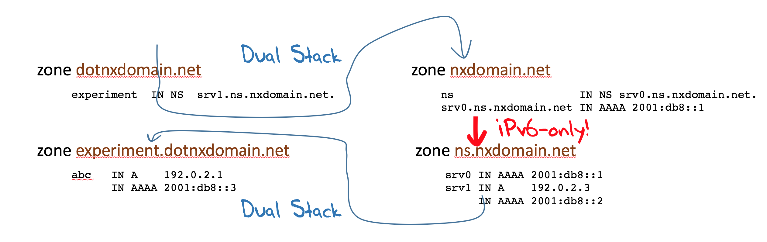 In order to resolve the name abc.experiment.dotnxdomain.net the resolver will query the name server for dotnxdomain.net and receive a response that indicates that the name experiment.dotnxdomain.net is a delegated domain and the name server of this delegated domain is srv1.ns.nxdomain.net., without any additional information providing the server’s IP address (as the delegation is “glueless”).