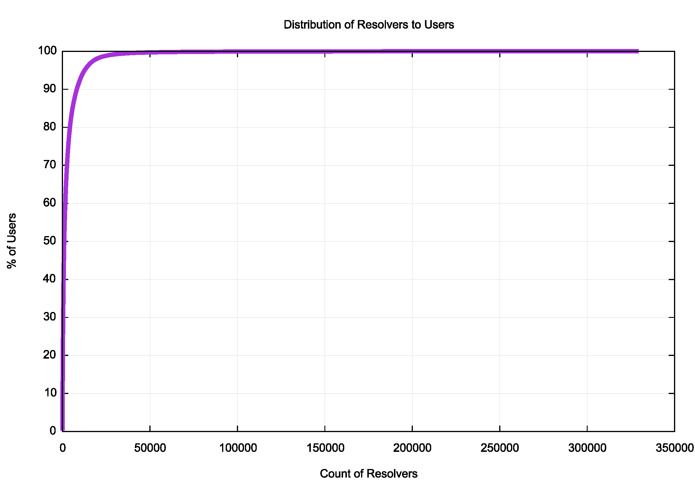 It is evident that some 8,000 visible resolvers (by IP address) handle 90% of the users’ experiment queries. (It should be noted that the number of actual resolvers handling this load is smaller than this 8,000 number, as the number of unique IP addresses querying authoritative name servers does not take into account DNS resolver farms, such as that operated by Google in their Public DNS service, or by other large multi-headed resolver instances).