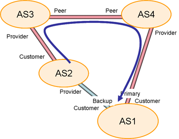 In this case AS1 has marked its advertisement of prefixes to AS2 as "backup only", and its advertisement of prefixes to AS4 as "primary". AS3 will hear AS4's advertisement across the peering link, and pick of AS1's prefixes with the path "AS4, AS1". AS3 will advertise this to AS2. AS2 will hear two paths to AS1, the first is by the direct connection to AS1, and the second is via the path "AS3, AS4, AS1". AS2 will prefer the longer path as the directly connected routes are marked "backup only", and AS2's local preference decision will prefer the AS3 advertisement over the AS1 advertisement. This is the intended outcome of AS1's policy settings, where no traffic passes from AS2 to AS1, and AS2, reaches AS1 via a path that transits AS3 and AS4. (Figure 2)