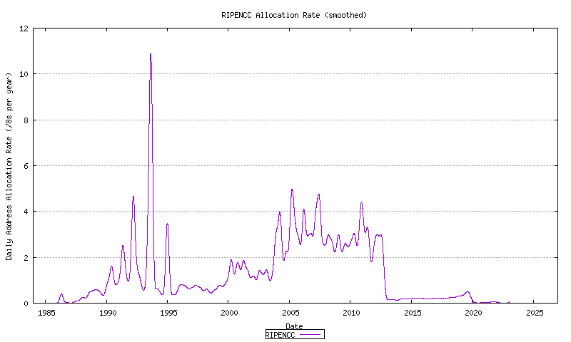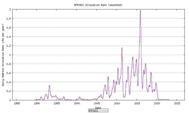 The RIR allocation data is indicated in Figure 19. This data is shown in both its original format, and in a smoothed format, using a sliding window smoothing algorithm, in a double pass of the smoothing algorithm across the data.
