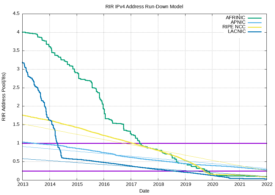 RIRProjected Exhaustion DateRemaining Addresses in RIR Pool (/8s)